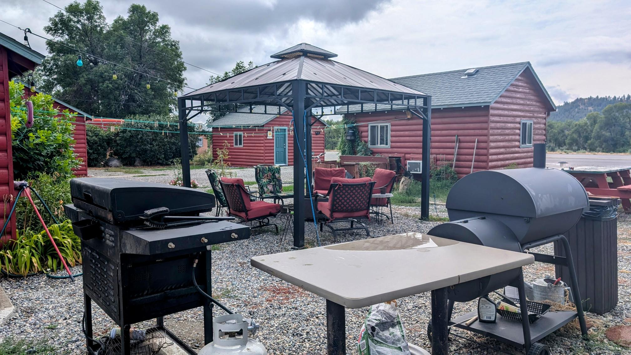 Complimentary gas grill and fire pit surrounded by comfy chairs